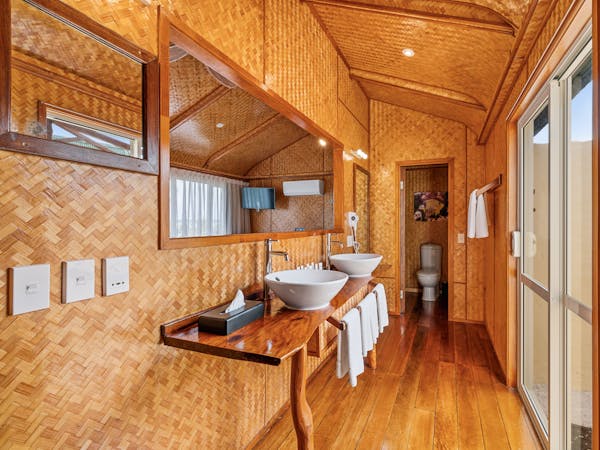 Perfect for couples seeking the ultimate Aitutaki honeymoon accommodation, this exclusive villa features a master bedroom with a draped four-poster king bed, flat-screen TV, air-conditioning, and an ensuite with a stunning coral-lined outdoor Polynesian-style rain shower temple — an unforgettable island indulgence.