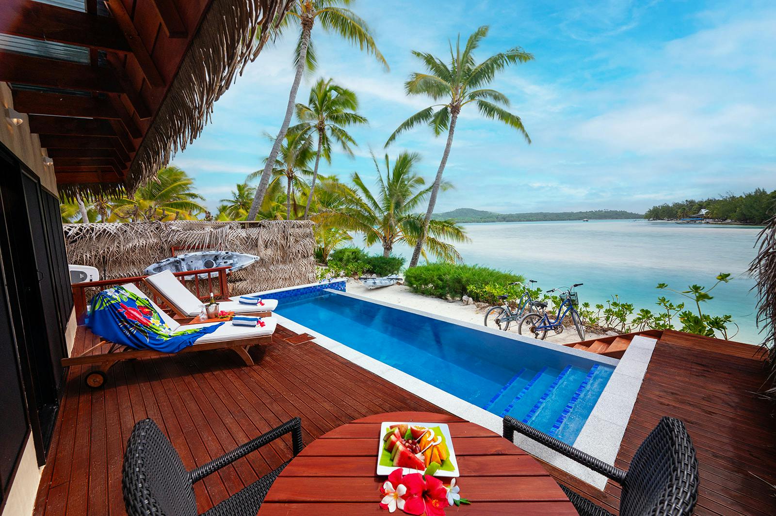 Our Beachfront Private Infinity Pool Villas combine seclusion, romance, and breathtaking lagoon views. Step from your deck into your own infinity pool, overlooking the vivid blues of the Aitutaki Lagoon. These villas feature a fully equipped kitchen, indoor/outdoor living spaces, king-size bed, open-air shower, and complimentary water sports equipment for a complete luxury escape.